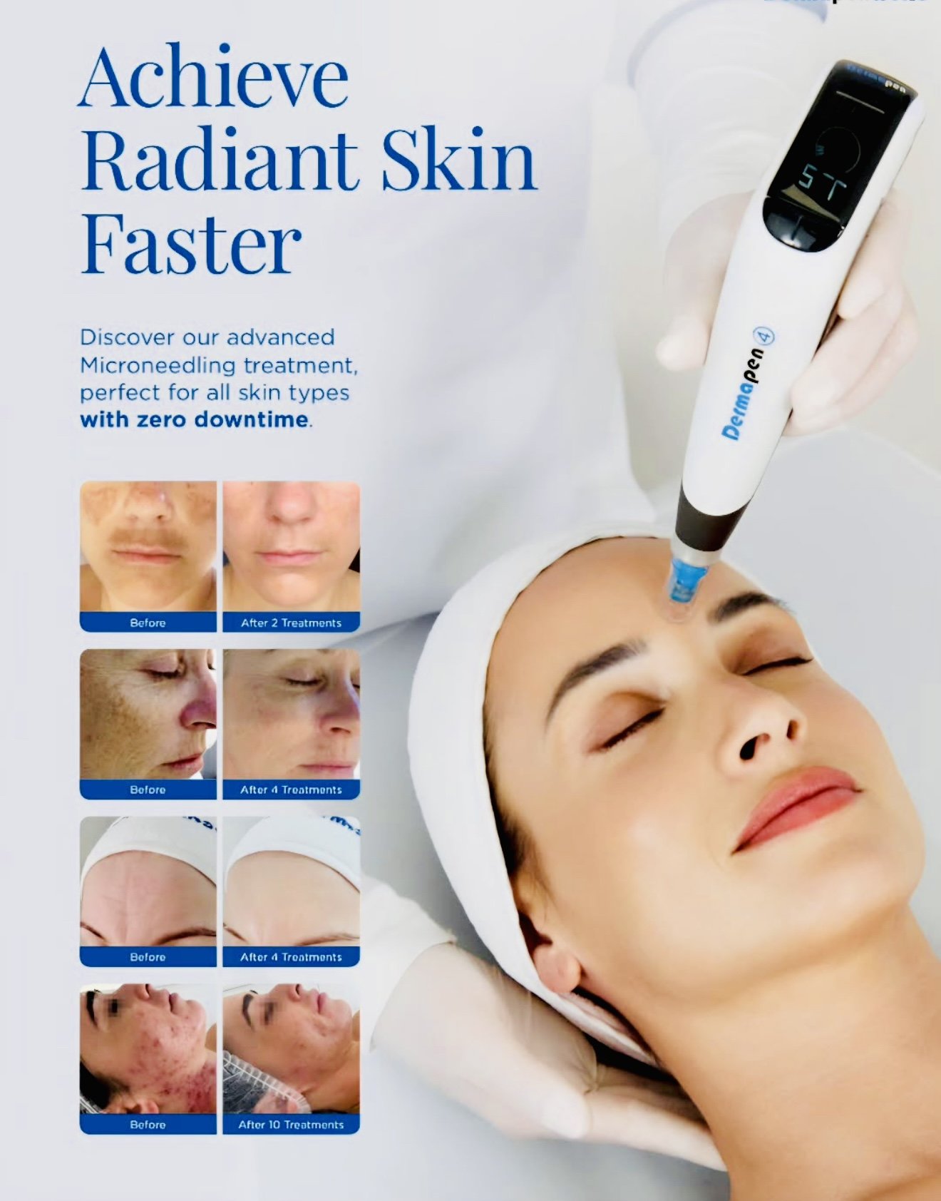 Designed to boost our skin’s cell renewal process and increase the skin quality by increasing collagen production. It does this by using thousands of “micro-needles” to start the body’s wound healing process. The body begins to break down damaged tissue and produce healthy new cells. Those cells repair and remodel the injured tissue, producing collagen and elastin to smooth out scars, wrinkles, oversized pores, and a variety of skin issues. This treatment is extremely effective at breaking up scar tissue, whether it is on the face (acne scarring, surgical scars, etc.) or on any part of the body!